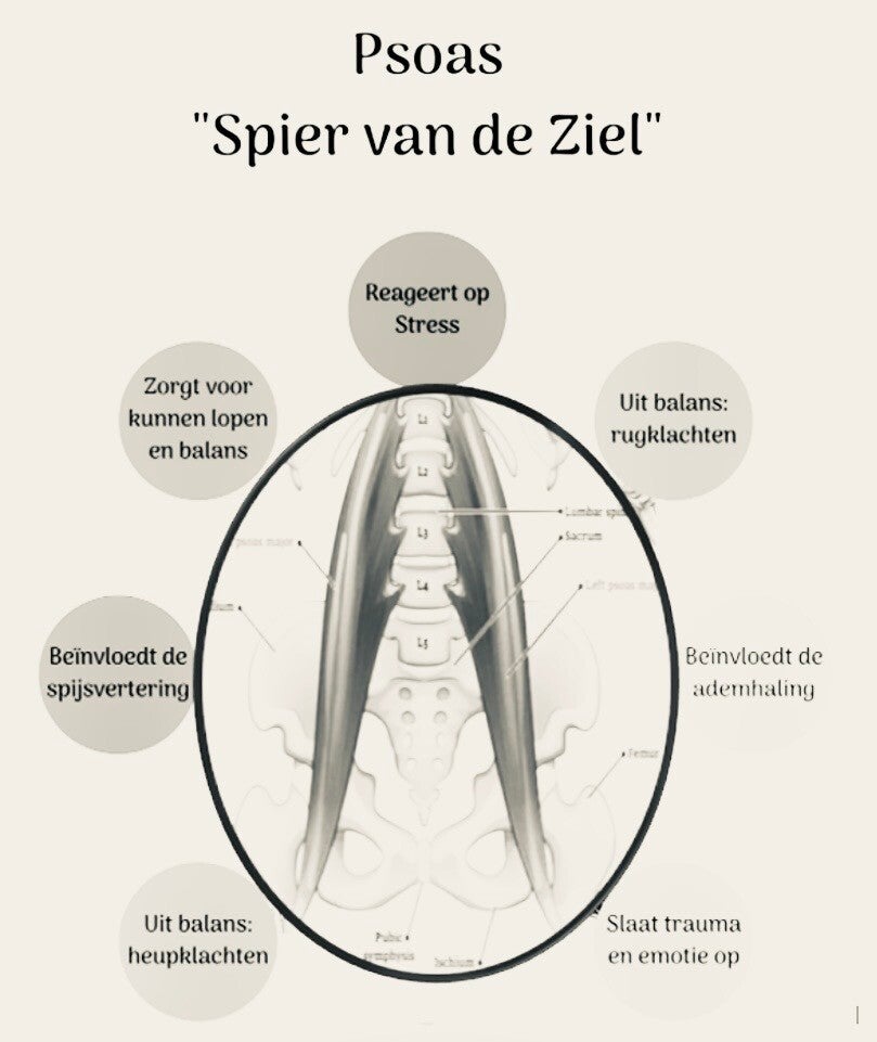 De Psoas -de grote lenden-spier- is de diepste kernspier in het lichaam. Het verbindt de wervelkolom met de benen en maak het mogelijk dat het lichaam in balans is en kan bewegen. Het is een van de belangrijkste spieren voor houding, ademhaling en stressregulatie. De Psoas wordt de "spier van de ziel" genoemd omdat het direct reageert op stress, trauma en emoties door samen te trekken. Bij lang aanhoudende spanning kan het ervoor kan zorgen dat je heup-, rug- en bekkenklachten krijgt.